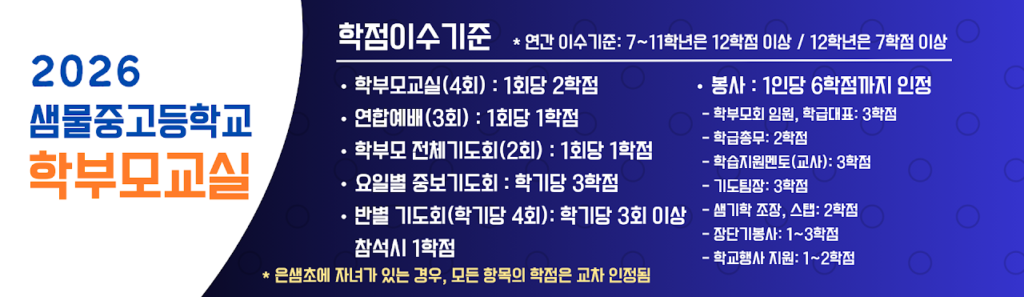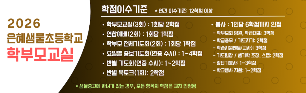 초등학교,중고등학교는 학점제를 운영하여 부,모 각각 1년에 1-11학년 12학점 / 12학년 7학점을 이수해야 합니다. 학점 결과는 학생 진급 심사에 반영될 수 있습니다. 학점 운영 기준은 학교 사정에 따라 매년 변경될 수 있으며 입학 후 상세안내드립니다. 초중고에 함께 자녀가 재학중인 경우, 모든 항목의 학점이 교차인정됩니다. 부득이한 사정으로 불참 시 일부 영상이 제공되는 프로그램에 한해 소감문으로 대체 하실 수 있습니다. 기도회 역시 오프라인 모임 참여가 어려우신 가정에서는 줌 모임으로 참여하실 수 있는 점 참고바랍니다.