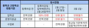 • 1월 27일부터 입학을 포기하는 경우나 등교를 하지 않는 경우, 수업료는 등교일 기준에 따라 반환하며 입학금 및 운영지원금은 전액 반환이 불가합니다.